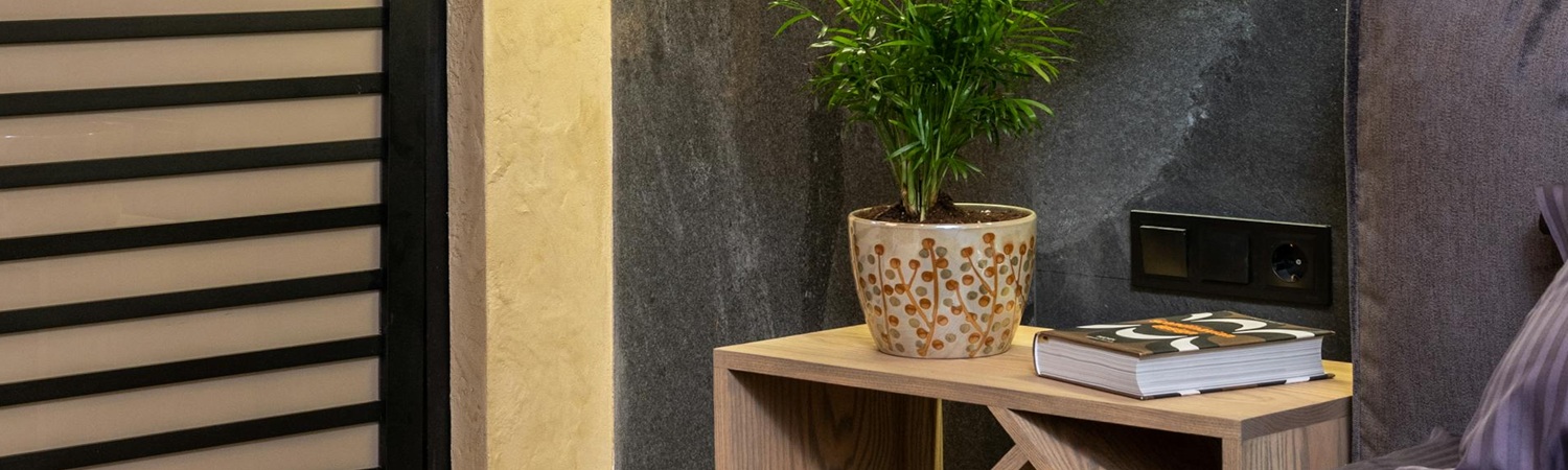 Wooden bedside table with plant
