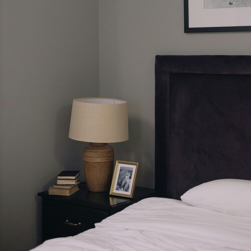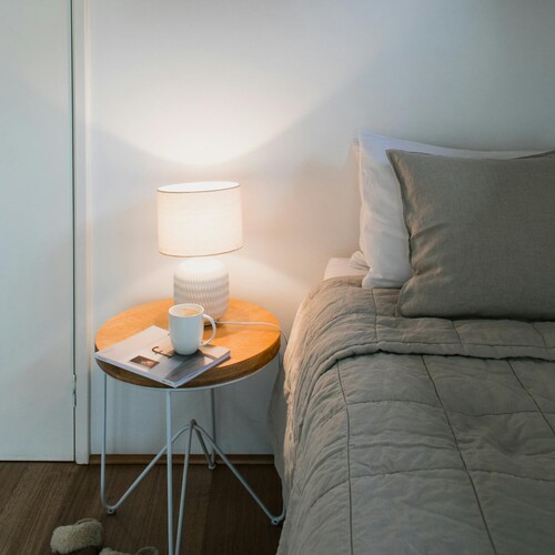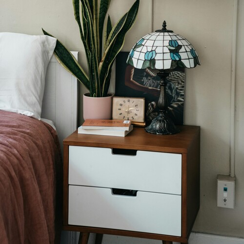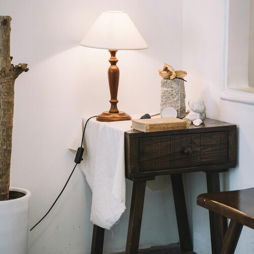 Wooden bedside table with lamp